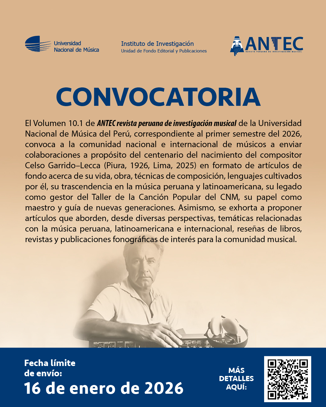 El Volumen 1 de ANTEC: Revista de investigación musical de la Universidad Nacional de Música del Perú, correspondiente al primer semestre del 2026, convoca a la comunidad nacional e internacional de músicos a enviar colaboraciones a propósito del centenario del nacimiento del compositor Celso Garrido–Lecca (Piura 1926, Lima, 2025) en formato de artículos de fondo acerca de su vida, obra, técnicas de composición, lenguajes cultivados por él, su trascendencia en la música peruana y latinoamericana, su legado como gestor del Taller de la Canción Popular del CNM, su papel como maestro y guía de nuevas generaciones. Asimismo, se exhorta a proponer artículos que aborden, desde diversas perspectivas, temáticas relacionadas con la música peruana, latinoamericana e internacional, reseñas de libros, revistas y publicaciones fonográficas de interés para la comunidad musical: